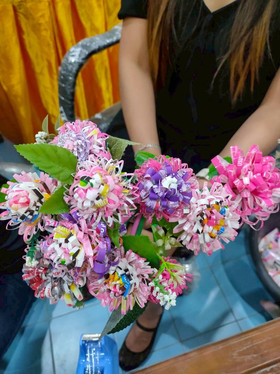 ม้วนดอก: ม้วนถุงส่วนที่ไม่ได้ตัดให้เป็นรูปดอกไม้ โดยทำดอกเล็ก (ดอกใน) ก่อนแล้วใช้เทปกาวพันโคน จากนั้นนำดอกในมาแนบแล้วม้วนดอกนอกทับให้แน่น.