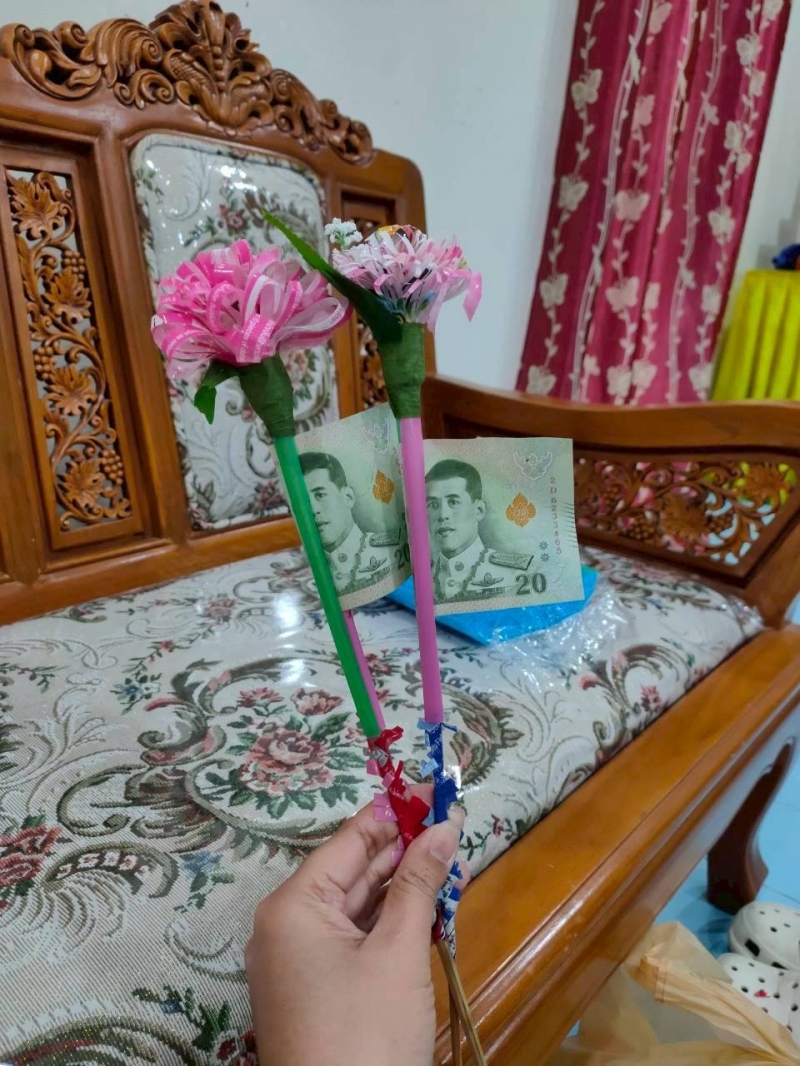 ตกแต่ง: นำดอกไม้ที่ทำเสร็จแล้วไปจัดตกแต่งเป็นไม้กฐิน.